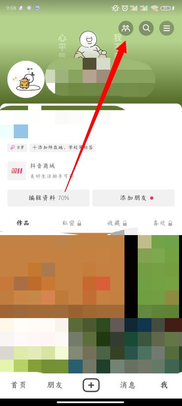 2、进入个人页面,点击右上角两个小人,这个就是访客按钮。