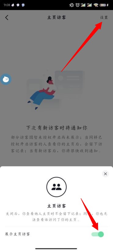 3、进入页面之后,点击右上角设置,弹出窗口开启展示主页访客,下次如果有访客到来就可以看到是谁了。