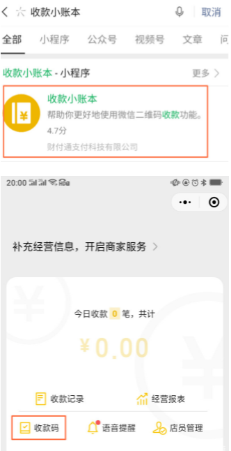 1、在微信搜索框输入收款小账本,点击收款码,申请一个官方收款码领取,这个是需要邮寄。
