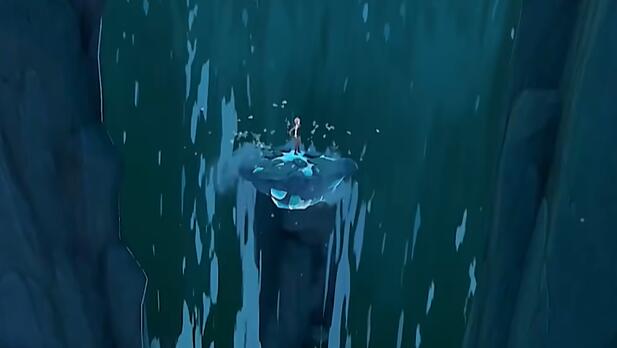 3、接着角色需要进入瀑布,先将左边的石头击碎。