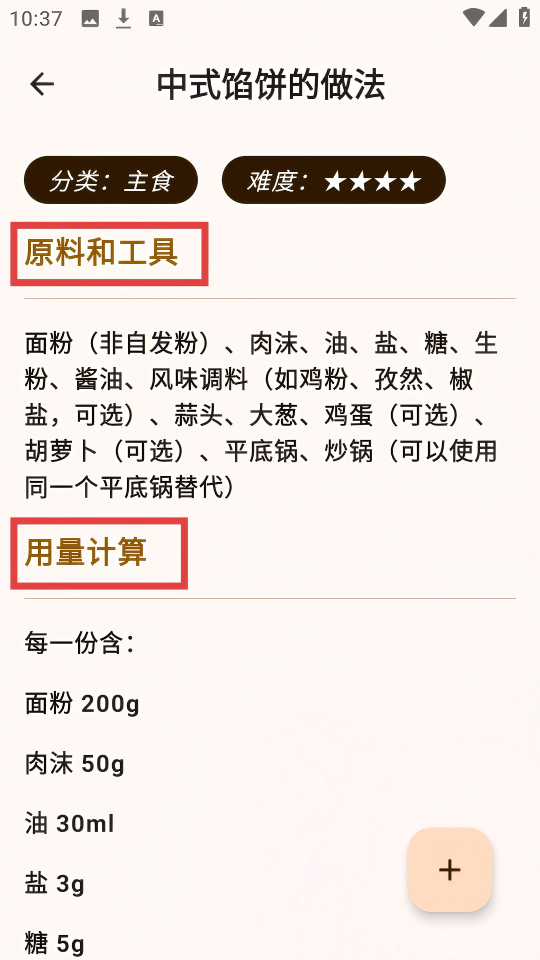 4、查看中式馅饼做法中的【原料和工具】及用量计算内容,准备制作食材和器具。