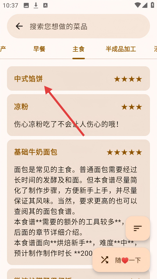 3、在主食分类列表中,选择【中式馅饼】选项,进入其做法详情页。