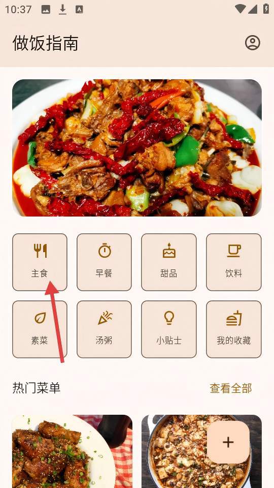 2、进入做饭指南页面,点击【主食】分类图标,浏览主食类菜品。