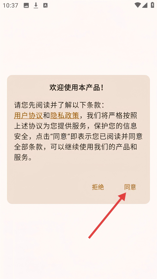 1、在欢迎使用本产品的弹窗中,点击【同意】按钮,接受用户协议和隐私政策。