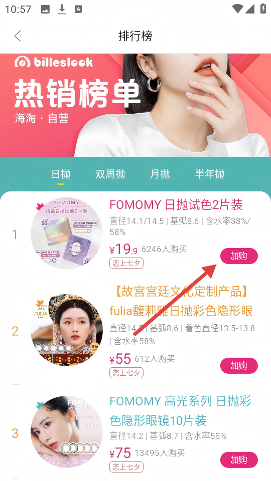 2、在排行榜日抛分类中,点击【FOMOMY日抛试色2片装】右侧的【加购】按钮。