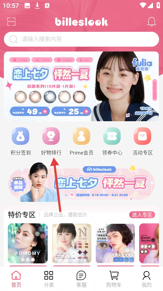 1、进入billeslook首页,点击【好物排行】图标,查看热销榜单。