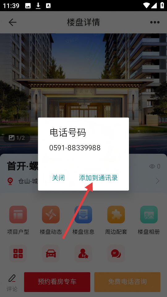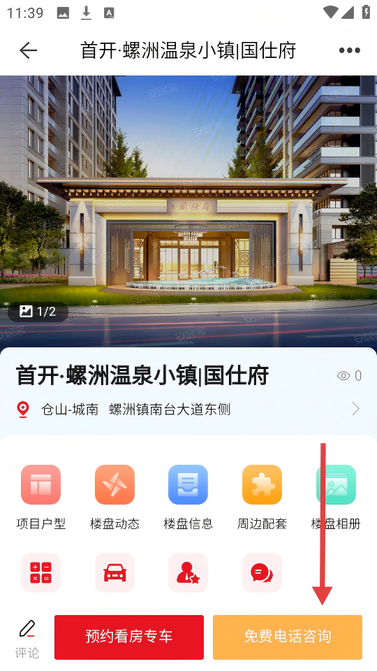 3、进入楼盘详情页后,点击【免费电话咨询】,弹出号码弹窗。