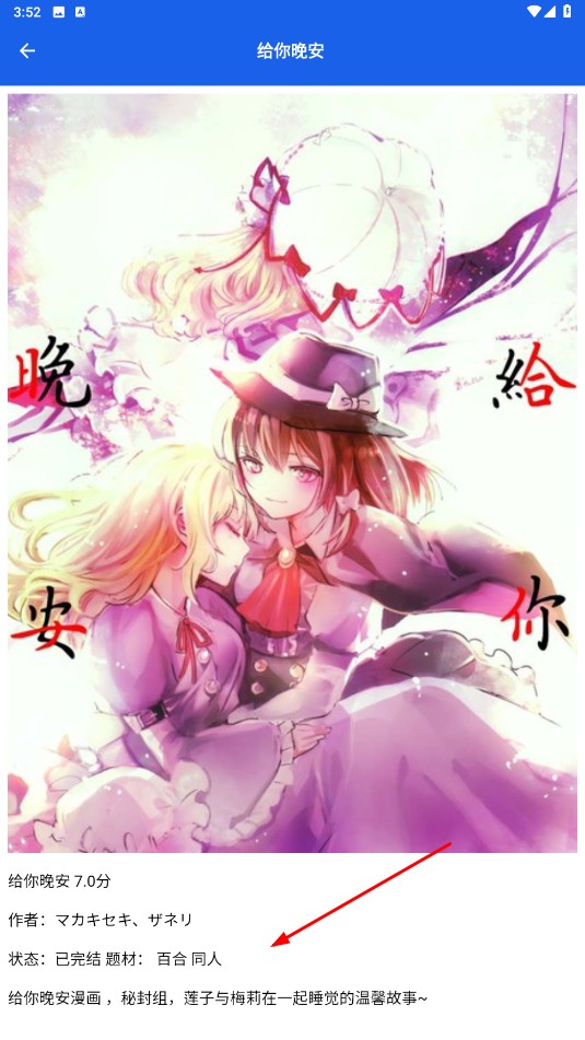 3、在漫画详情页,可查看“给你晚安”的评分、作者、状态、题材及故事简介。