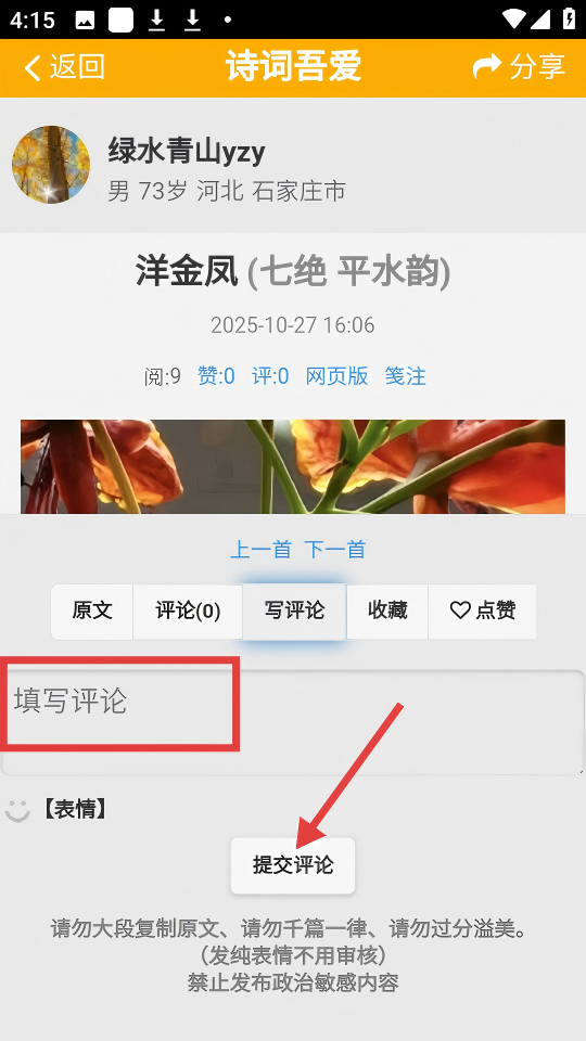 4、在评论填写框输入内容后点击【提交评论】可发布评论。
