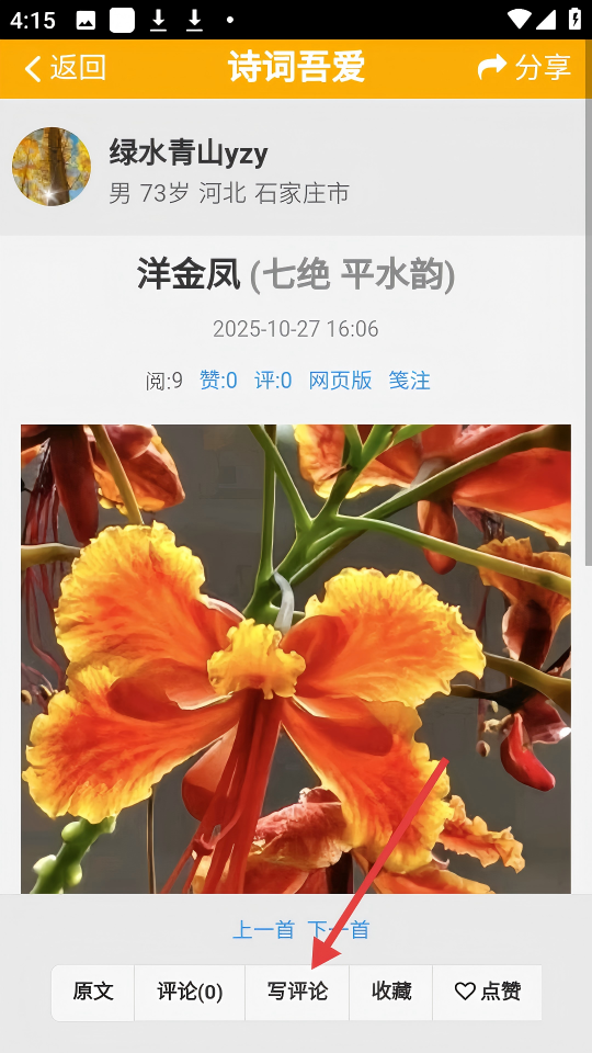 2、为用户搭建专属个人空间,支持发表原创诗词作品,还能对他人作品进行评论、点赞、分享,同时设有作品排行功能,激发创作积极性。