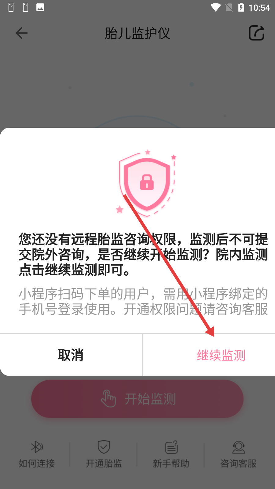 4、在权限确认弹窗中,点击【继续监测】按钮,开始胎儿监护监测。