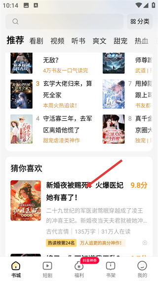 1、在书城的【猜你喜欢】板块,点击心仪的小说,进入该书的详情页面查看信息。