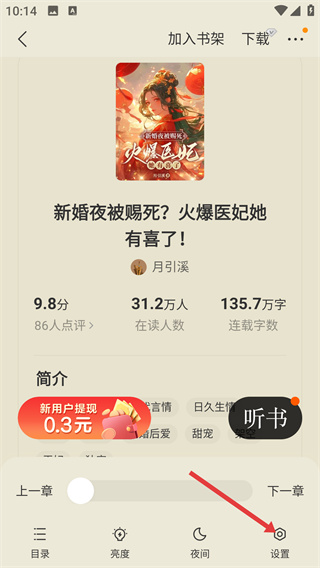 3、进入阅读界面后,点击底部的【设置】按钮,打开阅读设置页面,可调整阅读相关参数。