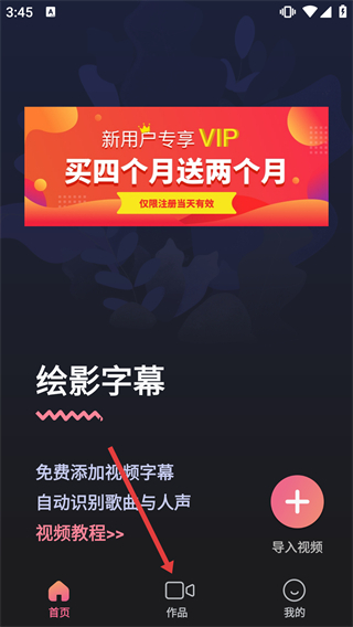 1、在绘影字幕首页点击底部“作品”选项,进入包含我的创作、成品视频的作品页面。