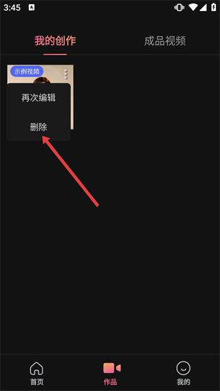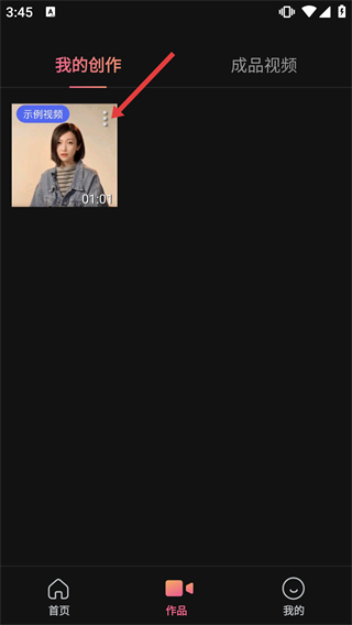 2、在作品页面的“我的创作”板块,点击示例视频对应的操作按钮,弹出操作选项菜单。