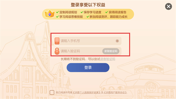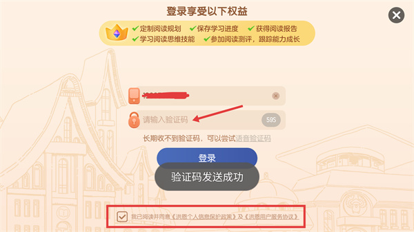 2、在登录页填写手机号,勾选《洪恩个人信息保护政策》及《洪恩用户服务协议》,准备获取验证码。