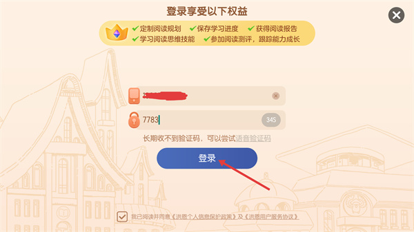 4、在验证码输入框填写收到的验证码,点击【登录】按钮,完成注册登录以使用牛津分级绘本服务。