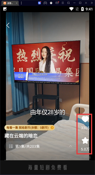 4、点击观看记录中的目标剧集,进入该剧集的播放界面,可通过界面右侧的按钮完成点赞、收藏等操作。