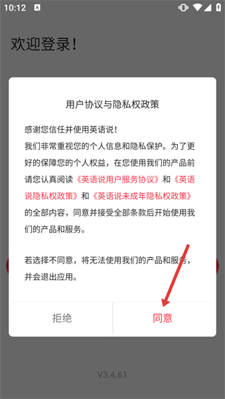 1、阅读《英语说用户服务协议》《英语说隐私权政策》《英语说未成年隐私权政策》的内容后,点击【同意】按钮,进入登录相关操作界面。