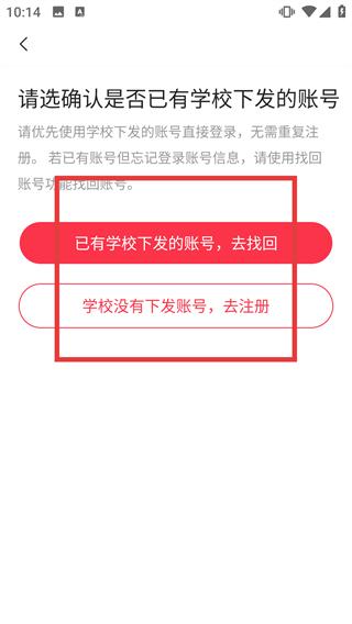 3、在学校账号确认页面,选择“学校没有下发账号,去注册”选项,进入注册账号的信息填写页面。