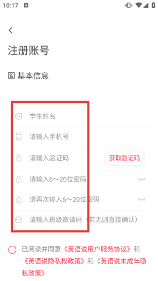 4、在注册账号页面,依次填写学生姓名、手机号、验证码、密码等基本信息,勾选相关协议后完成账号注册流程。
