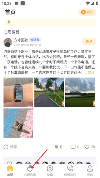 1、在首页点击底部【心理咨询】选项,进入心理咨询服务页面,可查看各类咨询师资源。