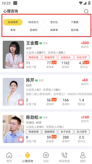 2、进入心理咨询页面后,可通过在线排序、综合实力等标签,筛选符合需求的咨询师列表。