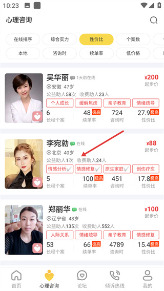 3、点击【性价比】标签,切换至该维度的咨询师列表,浏览对应咨询师的专业信息。