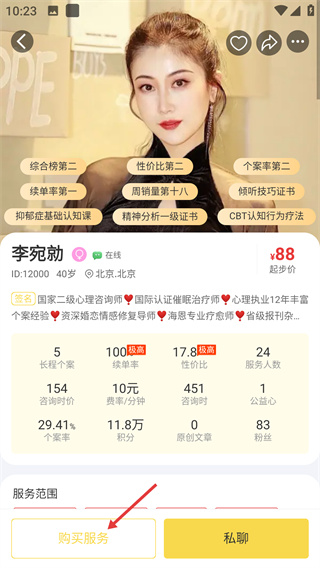 4、进入目标咨询师的详情页,点击【购买服务】按钮,推进该咨询师的咨询服务流程。
