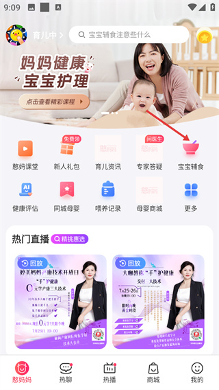 1、在“憨妈妈”首页点击【宝宝辅食】选项,进入宝宝辅食专属页面,该模块按宝宝月龄提供科学饮食建议与辅食食谱,适配不同成长阶段的营养需求。