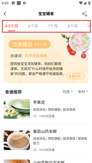 2、在宝宝辅食页面,通过顶部月龄标签选择对应宝宝月龄,查看该阶段的饮食指导及推荐食谱。
