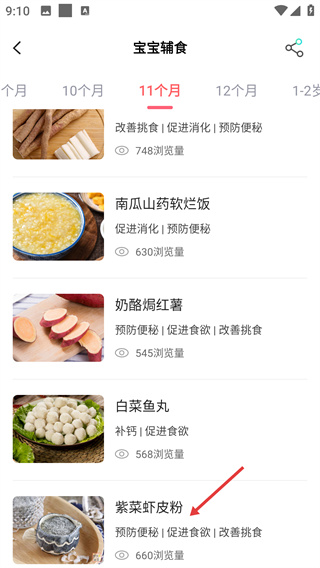 3、切换至目标月龄的食谱列表,点击【紫菜虾皮粉】食谱条目,进入该辅食的详情页面。