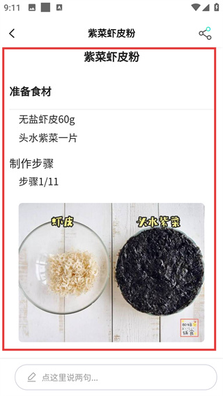 4、在紫菜虾皮粉详情页,查看准备食材及分步制作步骤,获取该辅食的具体制作方法。