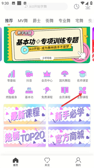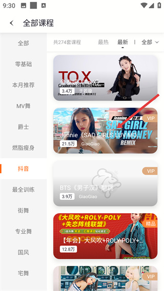 1、在首页点击【全部课程】选项,进入全部课程页面,该页面汇总各类舞蹈课程,支持按分类、热度/最新等维度筛选课程资源。