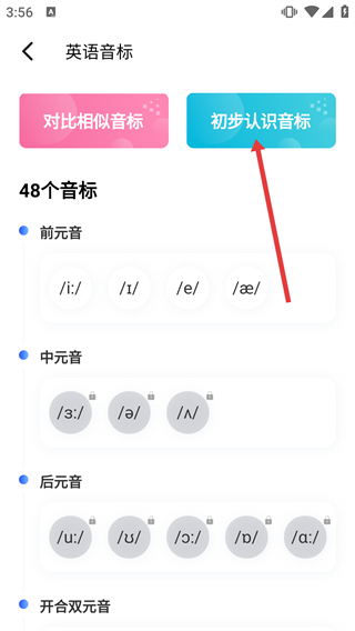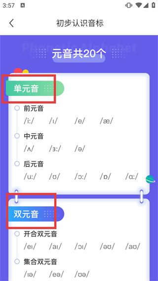4、在初步认识音标的界面中,可查看元音的分类:包含单元音与双元音,以及对应的音标符号。