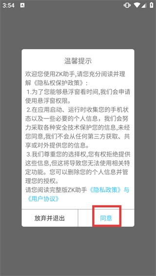 1、阅读ZK助手的《隐私政策》与《用户协议》后,点击弹窗中的【同意】按钮,进入应用的时间校准主界面。
