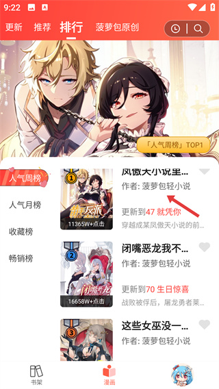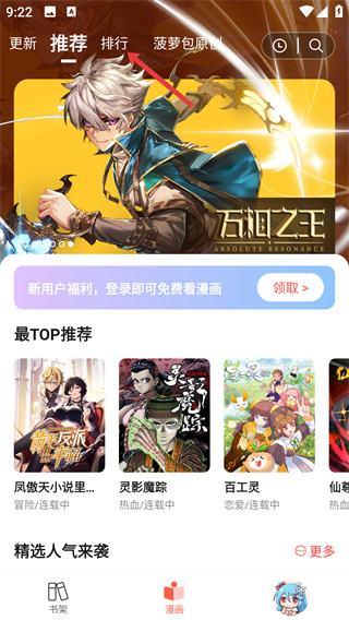 1、进入应用推荐页面,顶部有【更新】【推荐】【排行】等分类标签,点击【排行】标签,切换至漫画的排行展示页面。