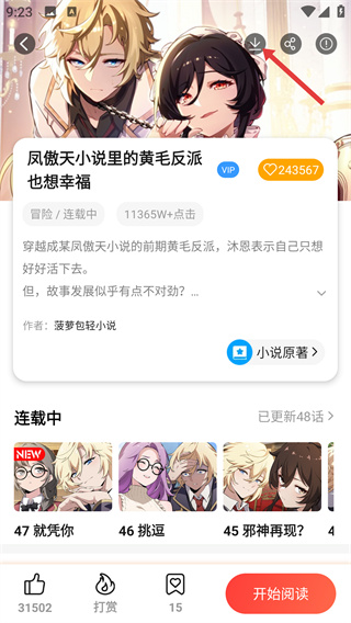 3、进入漫画详情页,可查看作品简介与连载章节,点击页面右上角的下载按钮,进入该漫画的缓存目录列表页面。