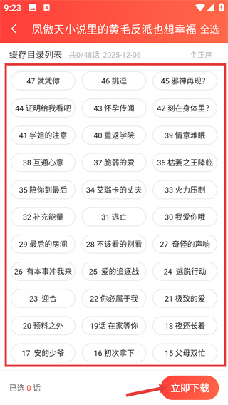 4、在缓存目录列表页面,选定目标漫画章节后,点击底部的【立即下载】按钮,完成对应章节的缓存下载操作。