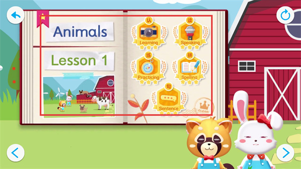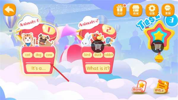 2、在课程选择页面,选定“Animals1”课程模块,该模块包含cat、dog等动物类单词,对应基础句型“It'sa...”的启蒙学习。