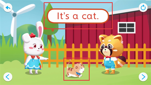 4、进入具体学习内容页,跟随动画引导学习句子“It'sacat”,结合对应的小猫形象,完成单词与句型的关联认知及口语表达练习。