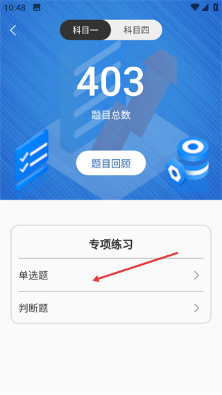 3、在专项练习页面选择【单选题】分类,进入该题型的答题练习环节,针对性训练这类题型的解题能力。