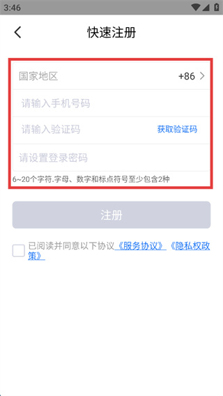 2、进入快速注册页面后,需依次填写国家地区、手机号码,后续还需补充验证码及符合要求的登录密码。