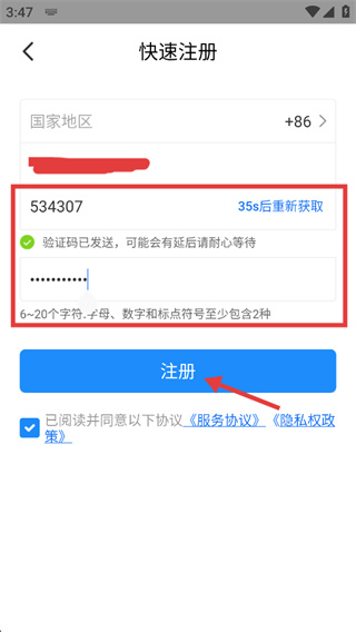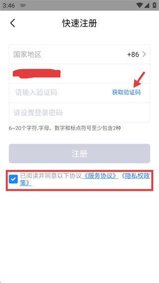 3、在快速注册页,先勾选“已阅读并同意”相关协议,再点击“获取验证码”按钮,申请注册所需的验证信息。