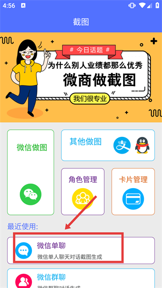 1、在微商截图工具主界面,点击“微信单人聊天对话截图生成”选项,进入微信单聊的角色选择页面。