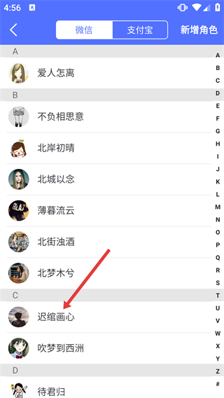 2、在角色选择页面,选定目标角色(如“迟绾画心”),进入对应的微信单聊界面。