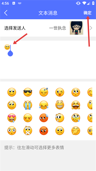 4、在文本消息页面,选择所需表情后,点击右上角“确定”按钮,完成该条对话内容的添加。