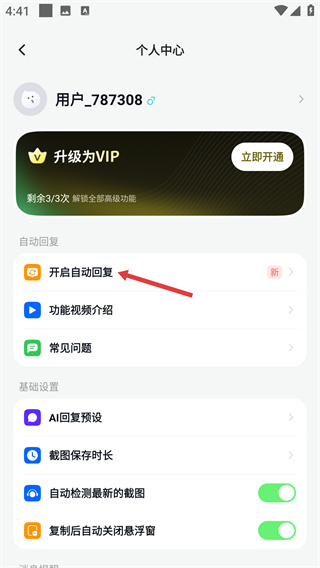 2、进入个人中心页面,找到“开启自动回复”功能项,点击进入对应的设置界面。