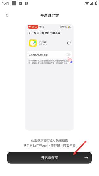 4、进入开启悬浮窗的配置页,点击“开启悬浮窗”按钮,完成悬浮窗权限的开启操作。