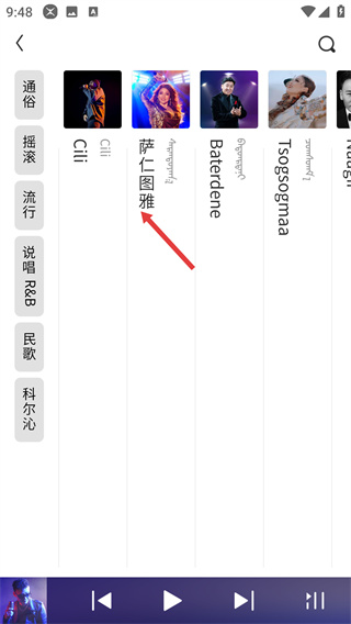 1、进入音乐软件的歌手分类页,找到【萨仁图雅】对应的条目,点击该条目进入这位歌手的专属音乐内容页面。
